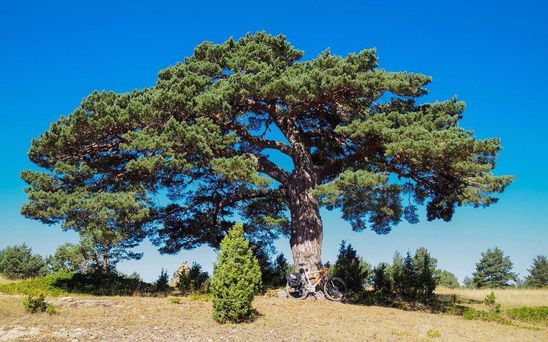 A 1,2 kms de la salida, la pendiente comienza a remitir y llegamos al punto más elevado de la ruta (estaremos a 1740 msnm). Seguimos por terreno mucho más favorable y relajado que al principio, hasta llegar al Pino Lentejas (a 3,14 kms de la salida). Se trata de un gran ejemplar de pino laricio, que bien merece una foto para el recuerdo.