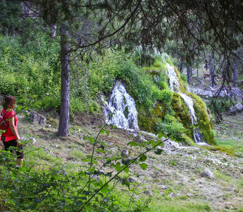 Iniciamos el camino hacia la Fuente, en ligera ascensión. A 500 metros de la salida, giramos a la derecha y seguimos la pista que nos lleva directamente a la Cascada y Fuente de la Tejeda (1,5 kms desde el inicio). La zona dispone de varias mesas con bancos, donde podemos parar a tomar algo o, simplemente, disfrutar del murmullo del agua y el cantar de los pájaros.