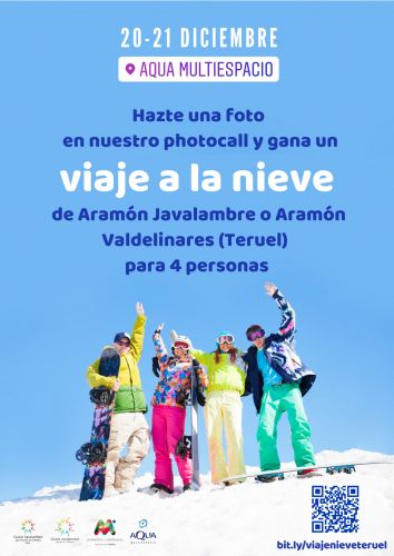 Acércate el próximo viernes 20 o sábado 21 a Aqua Multiespacio y participa en nuestro concurso para ganar un viaje para 4 personas a la nieve de Aramón Javalambre o Aramón Valdelinares (Teruel). Para concursar tendrás que hacerte una foto en nuestro photocall de nieve en Aqua Multiespacio. ¡Te esperamos!