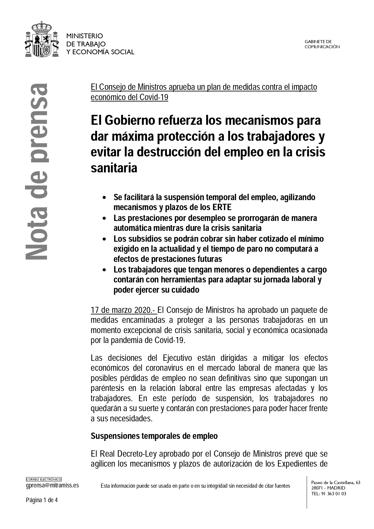 NOTA DE PRENSA: EL CONSEJO DE MINISTROS APRUEBA UN PLAN DE MEDIDAS CONTRA EL IMPACTO ECONÓMICO DEL COVID-19 19 Marzo 2020 Noticias Anterior Siguiente
