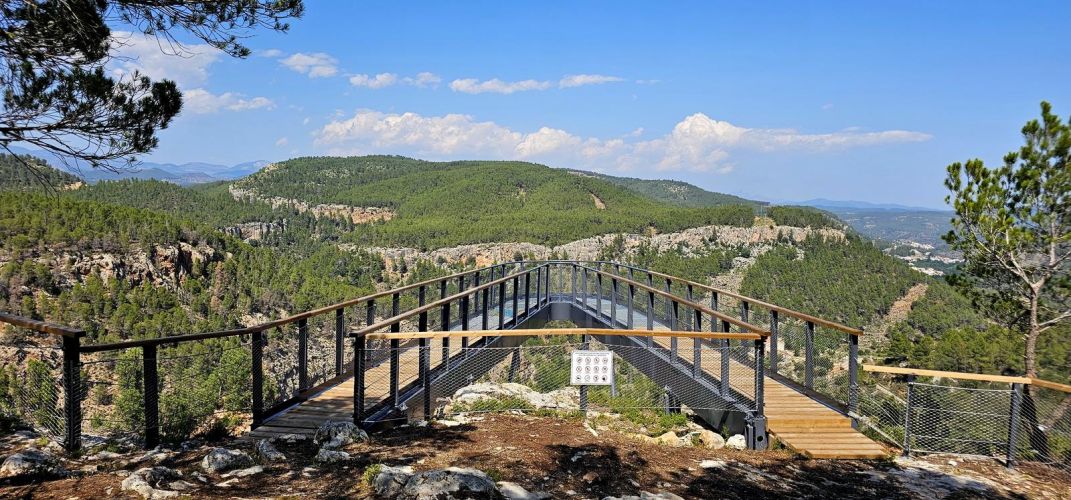 El nuevo mirador, ubicado sobre el espectacular Valle del Mijares, ofrece una experiencia visual impactante: una vista de 360 grados que abarca montañas, bosques y el curso del río, en un entorno donde el silencio y el aire puro son protagonistas.