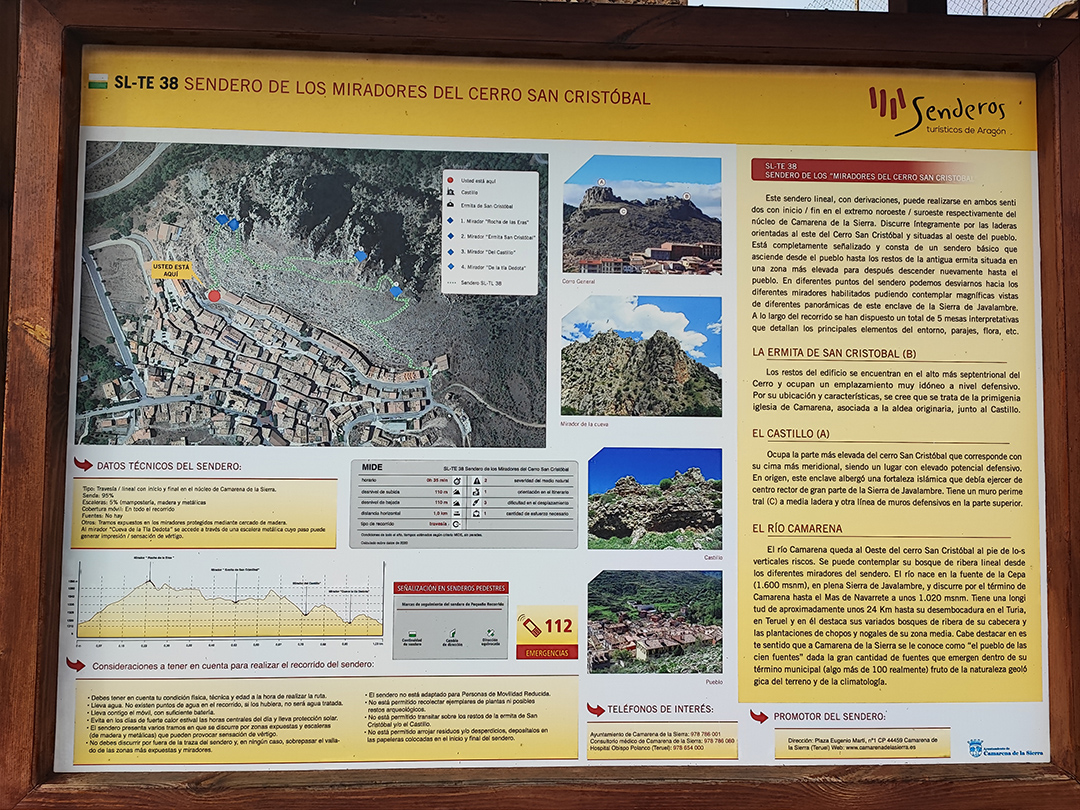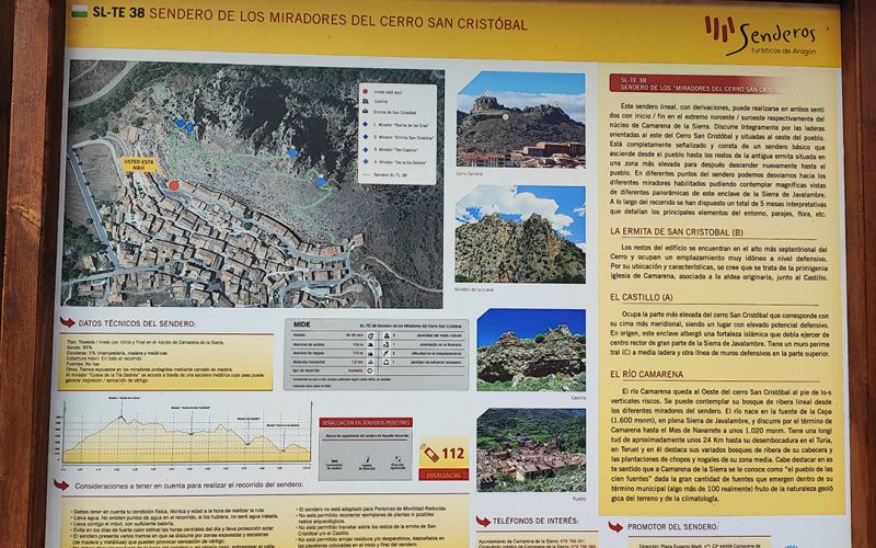 El sendero parte/finaliza en un punto del extremo Noroeste del núcleo de Camarena de la Sierra para llegar hasta otro punto del extremo Suroeste de este municipio, pudiendo recorrerse en ambos sentidos. Se trata de una ruta sencilla, acondicionada con escaleras, pasarelas y miradores, ideal para recorrer en familia, y que ofrece unas panorámicas espectaculares a escasos metros del pueblo.