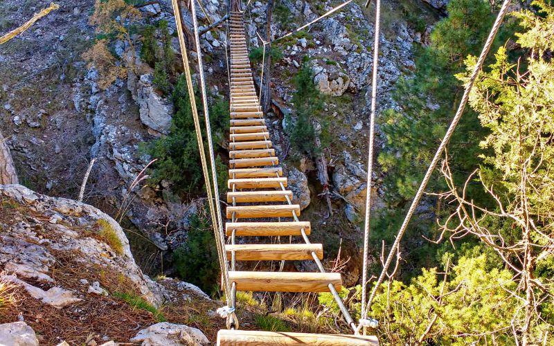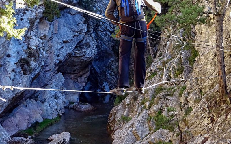 Termina con el paso más vertical de toda la ferrata, que nos lleva hasta un puente de madera. Desde este punto podemos acceder a la Ferrata Jurásica pero en este caso regresamos directamente a la zona de inicio.